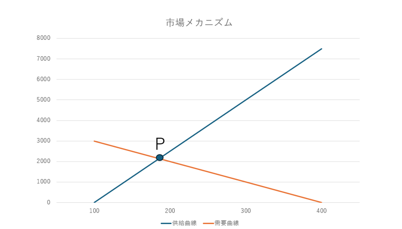 ある財・サービスを売る時、グラフで示したケースでは点P(1個2000円で200個販売)にすることが売り手側、買い手側双方にとって最もよく均衡がとれる。それよりも多く販売すると、売り手は在庫を抱える。逆に少なく販売すると、その財・サービスを買いたかった買い手全員に行き届かなくなる。