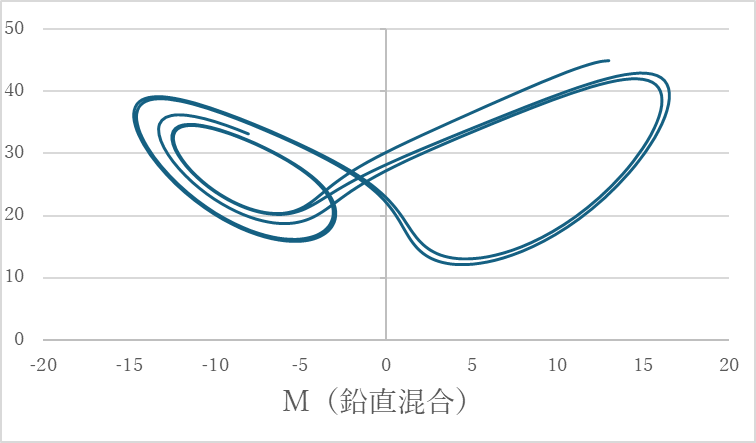 まるで左右対称の蝶の羽のような軌道だ。この“蝶の形”は偶然ではない。どれだけ時間が経っても、変数C・L・Mの動きはこの形から逸脱せず、しかし同じ軌跡を二度とたどらない。未来の状態は完全に決まっているが、初期値をほんの少しでも変えるとまったく別のパターンに飛んでしまう。完全に決定的なのに、予測不可能というわけだ。